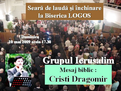 Share Facebook Twitter LinkedIn Pinterest Email Advertisement Your Ad Goes Here High-visibility banner placement Learn more Seara de lauda si inchinare la Biserica LOGOS Ploiesti cu Grupul IERUSALIM Mesaj: Cristi Dragomir Data: duminica 10 mai 2009, ora 17:30 Apreciază:Apreciază Încarc... Advertisement Your Ad Goes Here High-visibility banner placement Learn more