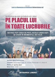 Seminarul ”Pe placul Lui în toate lucrurile”, sustinut sâmbata 17 Aprilie 2010 de Nate Belkstrom, te poate ajuta.