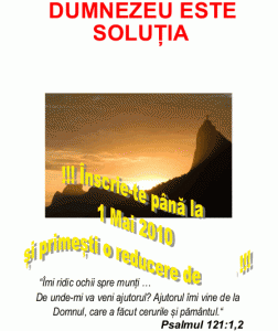 Tineri Pentru Misiune Romania – Lucrarea cu familii, impreuna cu Editura Kairos, va invita sa participati la tabara de familii “Dumnezeu este solutia” ce va avea loc in perioada 28 Iunie – 03 Iulie 2010 in loc. Dezna, jud. Arad.