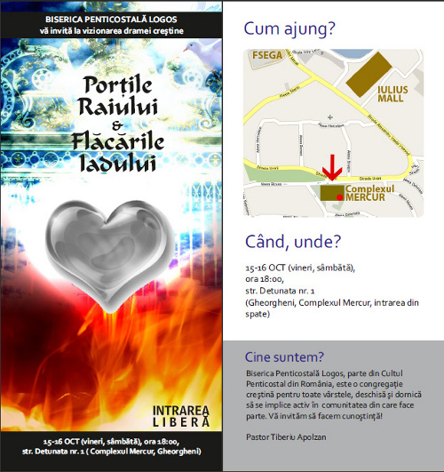 Biserica Penticostală Logos din Cluj-Napoca invită credincioşii evanghelici de toate vârstele la vizionarea dramei creştine „Porţile Raiului şi Flăcările Iadului”, prilej cu care vă încurajăm să participaţi însoţiţi de prieteni şi rudenii care au nevoie de o întâlnire personală cu Dumnezeu. Drama va fi pusă în scenă vineri, 15 OCT 2010 orele 18:00 şi sâmbătă, 16 OCT orele 18:00 şi va putea fi vizionată în cadrul Complexului Comercial Mercur din cartierul Gheorgheni, str. Detunata nr. 1.