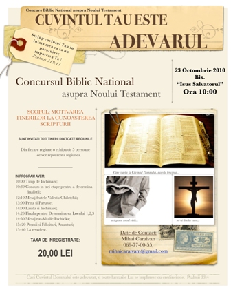 Sâmbătă, 23 octombrie 2010, Biserica „Isus Salvatorul” din Chişinău va găzdui Concursul Bilbic Naţional asupra Noului Testament. Programul începe la ora 10:00 şi va include laudă şi închinare, concursul Biblic în trei etape, mesaj Biblic în limba rusă şi română, pauză de masă şi părtăşie. În limba română va predica Preşedintele Federaţiei Europene Baptiste, Valeriu Ghileţchi, iar în rusă pastorul Bisericii „Golos Istini”, Vitalie Pochitka. Sub Moto-ul „Cuvântul tău este adevărul”, concursul urmăreşte scopul de a motiva tinerii la cunoaşterea Scripturii. Evenimentul este organizat de Departamentul de Tineret a Uniunii Bisericilor Creştine Evanghelice din Republica Moldova. Pentru detalii accesaţi www.doinitabejenaru.wordpress.com