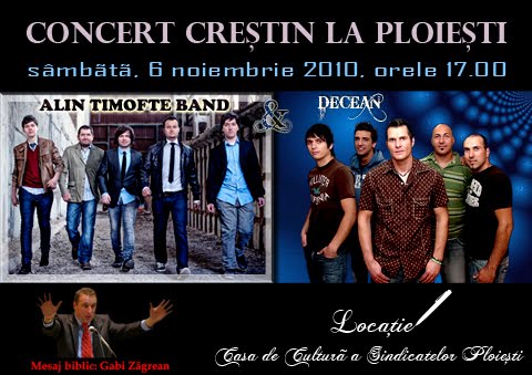 Sâmbată, 6 noiembrie 2010, la ora 17, va avea loc un concert creștin, la Ploiești. Locația concertului e Casa de Cultura a Sindicatelor. Vor cânta Alin Timofte Band și Decean. Mesajul biblic va fi prezentat de pastorul Gabi Zagrean.