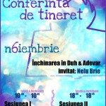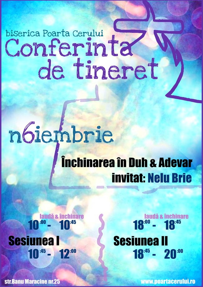 Sambată 6 noiembrie sunteţi invitaţi la Conferinţa de tineret de la Biserica Penticostală Poarta Cerului Timişoara de pe Str. Banu Maracine nr 25 cu tema Inchinare in Duh şi Adevar