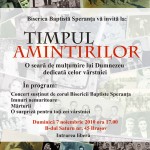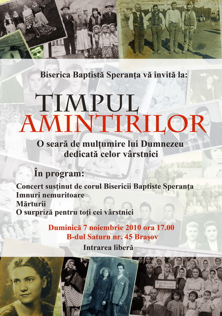 Biserica Baptistă Speranţa de pe B-dul Saturn nr. 45 Braşov vă invită Duminică 7 Noiembrie ora 17:00 La timpul Amintirilor, la o seară de mulţumire Lui Dumnezeu, dedicată celor vârsnici.