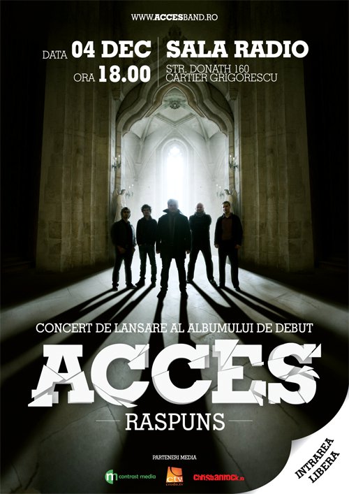 Share Facebook Twitter LinkedIn Pinterest Email În data de 4 decembrie de la ora 18:00 trupa AccesBand vă invită la un concert de lansare al albumului de debut ACCES Răspus. Care va avea loc in Cartier Grigorescul str.Donath Nr.160. Apreciază:Apreciază Încarc...