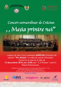 Concert extraordinar de Crăciun ,, Mesia printre noi” susţinut de către Corul studenţesc AMICUS, Orchestra de cameră Pro Nobile şi solişti de marcă ai României. Concertul va avea loc în data de 15 decembrie 2010, ora 18.00, sală C.A. Rosetti, nivel S1, Palatul Parlamentului. Revista RE:SPIRO oferă 30 de invitaţii! Tot ce trebuie să faci este să trimiţi un e-mail la revista_respiro@yahoo.com cu numele tău şi invitaţia îţi aparţine! Invitaţiile vor fi disponibile cu 30 de minute înainte de concert, la intrarea în Palatul Parlamentului, pe baza numelui confirmat prin email.