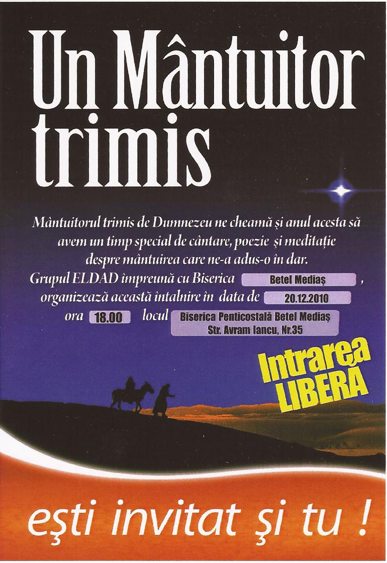 Mântuitorul trimis de Dumnezeu ne cheamă și anul acesta să avem un timp special de cântare, poezie și meditație despre mântuirea care ne-a adus-o în dar. Grupul ELDAD împreună cu Biserica Betel Mediaș, organizează acestă întâlnire în data de 20.12.2010 ora 18.00 la Biserica Penticostală Betel Mediaș, str. Avram Iancu, nr 35