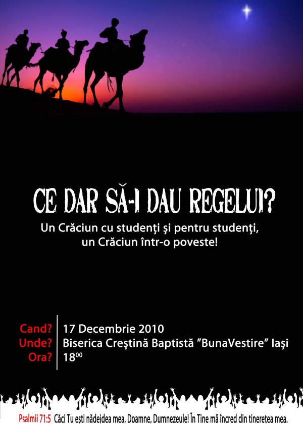 Vă invităm Vineri, 17 Decembrie 2010, începând cu orele 18:00, să lăudăm pe Domnul în cadrul uneiîntâlniri de tineri cu tema “Ce dar să-i dau Regelui” care va avea loc în incinta Bisericii Creștine Baptiste ”BunaVestire” Iași, strada Sărărie 32.