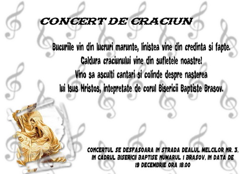 Duminică, 19 decembrie 2010, Biserica Baptistă nr. 1 din Braşov vă invită la o seară specială de crăciun. Corul bisericii locale va susţine un recital de melodii şi colinde cu mesajul naşterii Domnului Isus. Sunteţi aşteptaţi cu drag, începând cu ora 18:00 pe str. Dealul Melcilor nr. 3. Căldura Crăciunului vine din sufletele noastre, veniţi să ne bucurăm împreună dăruind din dragostea noastră celorlalţi.