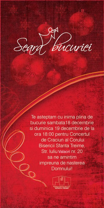În acest weekend, 18-19 decembrie 2010, Biserica “Sfânta Treime” din Bucureşti, vă invită la momente speciale de colind în cadrul concertului “Seara Bucuriei”. Repertoriul va cuprinde un recital de colinde de către corul bisericii locale. Sunteţi aşteptaţi să ne amintim de naşterea Mântuitorului, Domnul nostru Isus Cristos pe adresa str. Iuliu Valaori nr. 20.