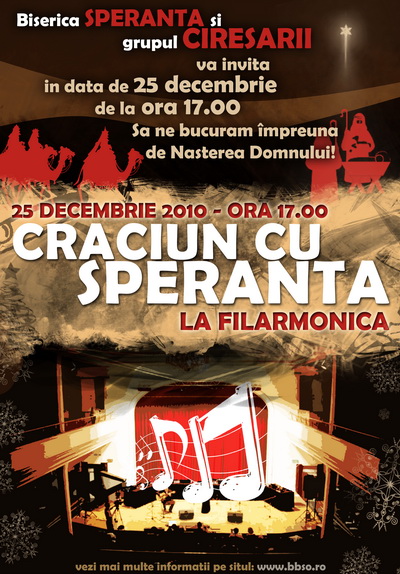 Sâmbătă, 25 decembrie 2010, Filarmonica din Oradea va găzdui un ocncert de colind organizat de Biserica Baptistă “Speranţa” şi grupul Cireşarii. Toţi orădenii sunt aşteptaţi să se bucure împreună de Naşterea Domnului începând cu ora 17:00. Biserica “Speranţa” din Oradea vă invită şi la alte servicii şi întâlniri cu ocazia sărbătorilor de iarnă. Pentru mai multe detalii despre orarul şi programul acestor accesaţi www.bbso.ro