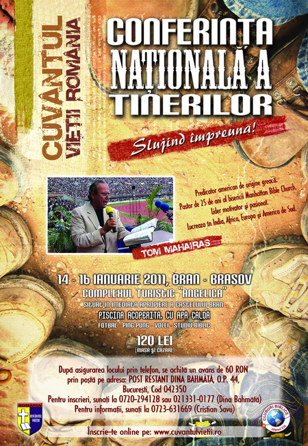 În perioada 14-16 ianuarie 2011, Cuvântul Vieţii România organizează CONFERINŢA NAŢIONALĂ A TINERILOR! Vă aşteptăm la Bran, Braşov – Complexul Turistic ”Angelica” (la 500m de Castelul Bran), pentru un timp excepţional de inviorare şi zidire din Cuvântul lui Dumnezeu alături de Tom Mahairas – pastor al bisericii ”Manhattan Bible Church” fondator şi iniţiator a mai multor misiuni în Africa şi Asia.