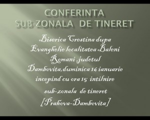 Biserica Crestină după Evanghelie din localiatea Baleni Romani (Prahova-Dâmboviţa) vă invită la conferinţa sub-zonală de tineret din data de 16 ianuarie de la ora 15 . Motooul intilnirii ” Răscumpăraţi vremea, căci zilele sînt rele. ”