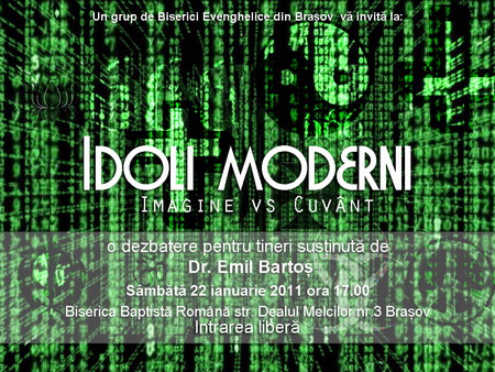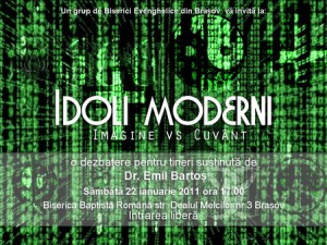 Un grup al bisericii Baptiste Română de pe str. Melcilor Nr.3 vă invită Sâmbătă 22 ianuarie 2011 de la ora 17:00 la o dezbatere pentru tineri cu tema Idoli Moderni – Imagine vs Cuvânt susţinută de Dr. Emil Bartoş.