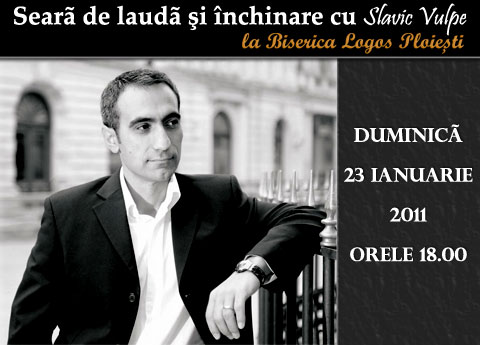 Duminică, 23 ianuarie 2011, Biserica “Logos” din Ploieşti vă invită la o seară specială de laudă şi închinare cu interpretul Slavic Vulpe. Sunteţi aşteptaţi cu mare drag, începând cu ora 18:00 pe adresa: str. Miciurina 6 (rondul 1 dinspre centru).
