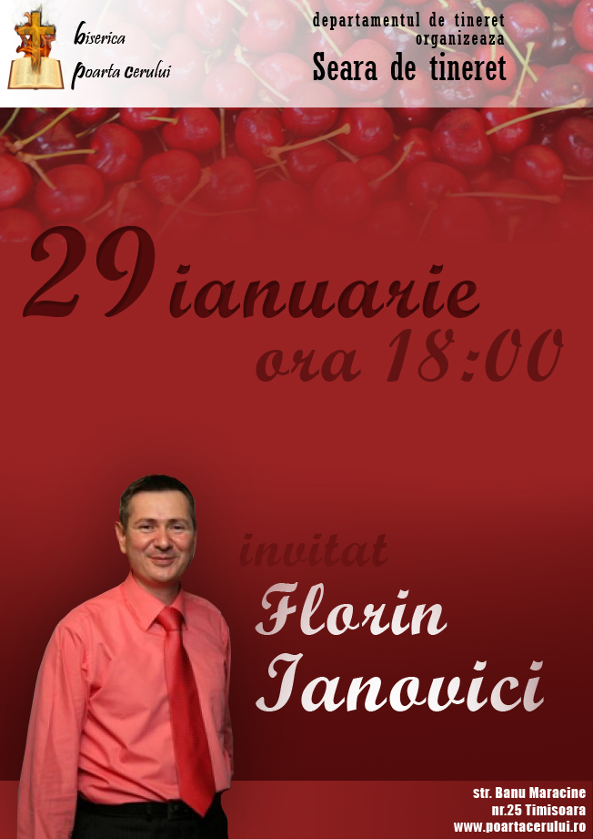 Departamentul de tineret de la Biserica “Poarta Cerului”, Timişoara, organizează o “Seara de tineret”, Sâmbătă, în data de 29 Ianuarie, începând cu ora 18:00. Invitat special va fi Florin Ianovici;