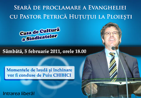 Sâmbătă, 05 februarie 2011, în incinta Casei de Cultură a Sindicatelor din Ploieşti se va organiza o seară de evanghelizare. Pentru momentul de închinare la eveniment a fost invitat interpretul Puiu Ghibici. Mesajul biblic de proclamare a Evangheliei va fi predicat de pastorul Petrică Huţuţui. Evenimentul începe la ora 18:00 cu intrarea liberă.