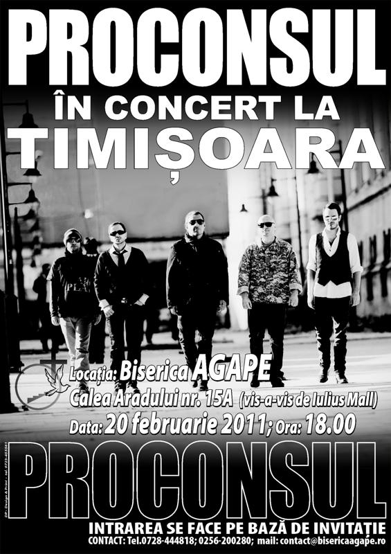 Duminică, 20 februarie, Proconsul va cânta într-un concert la Timişoara. Intrarea se face pe bază de învitaţie, preţul acesteia fiind 5 RON/invitaţie (invitaţia este pentru o singură persoana).