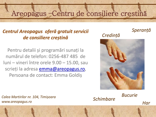 De luni, până vineri între orele 09:00 şi 15:00 Centrul Creştin “Areopagus” din Timişoara oferă servicii gratuite de consiliere creştină. Centrul “Areopagus” a fost fondat cu scopul de a servi drept o sursă de încurajare şi ajutorare pentru persoanele de peste hotare în procesul de acomodare cu limba şi cultura românească.