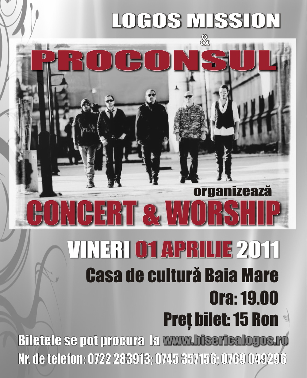 Logos Mission şi Proconsul organizează, Concert & Worship, care va avea loc în Baia Mare, la Casa de Cultura, în data de 01 aprilie 2011, începând cu ora 19.00. Detalii despre procurarea biletelor găsiţi pe site-ul Bisericii Logos – www.bisericalogos.ro sau la nr. de telefoane: 0722 283913, 0745 357156, 0769 049296. Pretul unui bilet este 15 Ron.