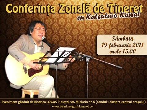 Sâmbătă, 19 februarie 2011, Biserica “Logos” din Ploieşti găzduieşte Conferinţa zonală de tineret. Evenimentul începe la ora 15:00 şi are intrarea liberă. Invitatul special este misionarul japonez, Katsutaro Kawai, un om cu inima plină de dragoste şi pasiune sfântă pentru salvarea sufletelor nemântuite. S-a convertit la 16 ani şi a fost renegat de familia sa de preoţi budişti. Doi ani mai târziu se stabileşte temporar în Statele Unite ale Americii. Aici absolvă Gordon – Conwell Theological Seminary şi Barklee College of Music din Boston, Massachusetts. În calitate de pianist al trupei “Continental Singers” ajunge prima dată în România, se îndrăgosteşte de ea şi se stabileşte ulterior în Cluj cu dorinţa de a se dedica misiunii. Eşti invitat să îi asculţi mesajul de consacrare pe altarul slujirii lui Dumnezeu încă din timpul celor mai frumoşi ani ai tinereţii. Invită-ţi şi prietenii tăi. Vino să te bucuri cu noi de o seară specială pe str. Miciurin nr. 6.