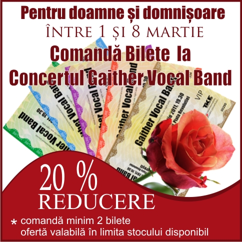 Ofertă specială de bilete pentru concertul Gaither Vocal Band din data de 15 martie 2011 pentru doamne și domnișoare, între 1 și 8 martie 2011! Pentru minim 2 biletele comandate aveți o reducere de 20%. Oferta este valabilă în limita stocului disponibil.