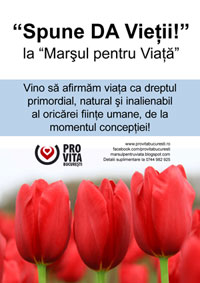 “Spune DA Vietii!” este sloganul “Marsului pentru Viata”, eveniment care va avea loc simultan la Bucuresti, Timisoara si Satu Mare, sambata, 26 martie 2011. Organizatorii, peste 20 de asociatii nonguvernamentale provita si profamilia, cheama astfel pe toti romanii la recunoasterea vietii umane ca primul si cel mai important drept, incepand de la conceptie si pana la sfarsitul ei natural.
