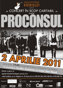 Dacă până acum ştiaţi de Proconsul cei de pe scenă, ei bine, acum aveţi posibilitatea să vedeţi o nouă “faţă” de-a lor. Cu toţii aţi auzit de schimbarea majoră ce a avut loc în vieţile lor. Astfel, cei de la Proconsul s-au decis să vină în Cluj şi să cânte în scop caritabil. Pentru cine? Pentru fiecare din noi. Care este motivul pentru care vin ei? Beneficiarii serviciilor sociale din cadrul Fundaţiei de Caritate Herald. Unde şi când? Concertul va avea loc la Casa de Cultură a Studenţilor de la orele 19:00 în data de 2 aprilie.