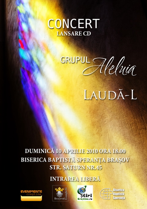 Share Facebook Twitter LinkedIn Pinterest Email Grupul Aleluia va susține un concert dumincă și va lansa albumul “Laudă-L“, în data de 10 aprilie 2011, ora 18.00 la Biserica Baptista Speranța din Brasov. Intrarea este liberă! Apreciază:Apreciază Încarc...