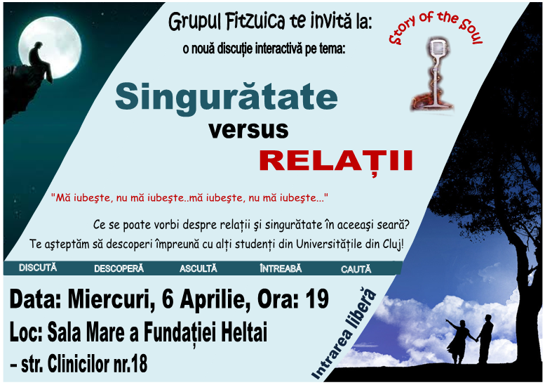 Share Facebook Twitter LinkedIn Pinterest Email Grupul Fitzuica te invita miercuri, 6 aprilie, ora 19 la o nouă discuție interactivă pe tema: Singurătate versus RELAȚII Loc: Sala Mare a Fundației Heltai, str. Clinicilor, nr 18. Apreciază:Apreciază Încarc...