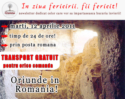 Librăria gramma.ro organizează astăzi, 12 aprilie 2011, ziua bucuriei, ziua în care orice comandă dată pe site-ul librăriei (www.gramma.ro) va fi onorată fără să i se perceapă taxe de transport.