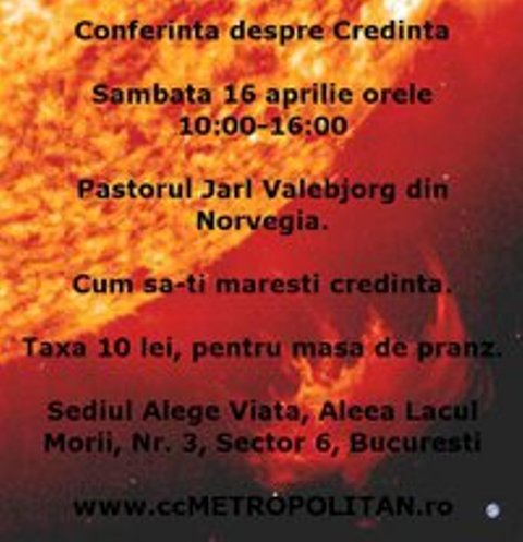 Sâmbătă, 16 aprilie Centrul Creştin Metropolitan vă invită la o conferinţă specială cu participarea pastorului Jarl Valebjorg din Norvegia. În cadrul evenimentului se va dezbate un subiect sensibil pentru zilele noastre: Credinţa. Dacă alegi să vii şi tu vei avea ocazia să descoperi: Ce este credinţa, cum o poţi folosi. Principii ale credinţei, cum să îţi măreşti credinţa, cum să trăieşti prin credinţă şi altele. Sesiunile durează 50 de minute fiecare.