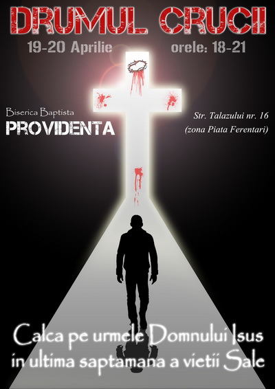 În data de 19-20 Aprilie 2011, sunteţi invitaţi la un Eveniment special intitulat “Drumul Crucii” la Biserica Baptistă Providența, Oradea, cu tema “Calcă pe urmele Domnului Isus în ultima săptămână a vieţii Sale”