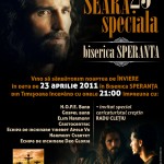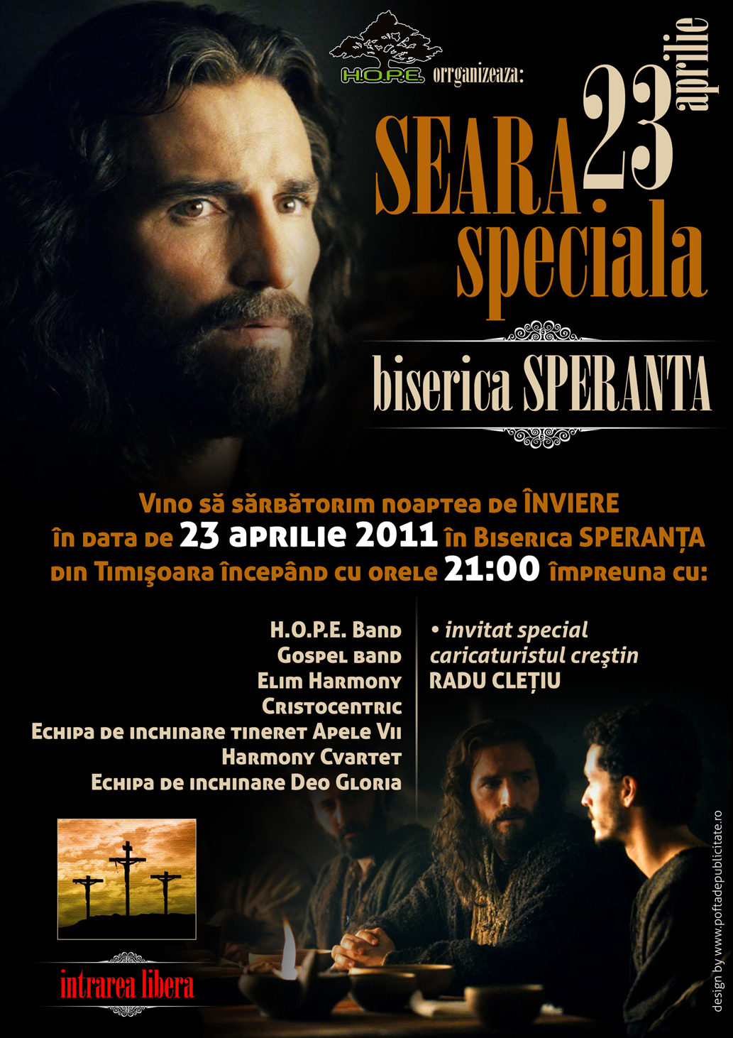 Departamentul de Tineret al bisericii penticostale Speranta Timisoara, strada Cernauti 49, are placerea de a va invita in data de 23 aprilie 2011 la a treia editie a Concertului de Pasti. Evenimentul incepe la ora 21 si va sfarsi dupa miezul noptii pentru a marca impreuna invierea Domnului intr-un mod cu totul aparte.