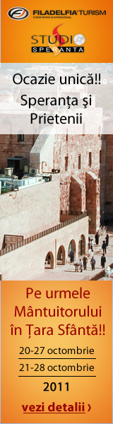Studio Speranta organizeaza, in colaborare cu Filadelfia Turism, un turneu in Tara Sfanta, Israel. Cu ocazia acestui turneu vor fi vizitate locurile pe unde odinioara a trecut Isus: Betleemul din Iudeea, Ierihonul, Marea Galileei, Iordanul, Cana Galileei, Muntele Fericirii, Mormantul Sfant si altele. Studio Speranta va invita sa va bucurati de o experienta unica, oferindu-va posibilitatea de a participa la inregistrarile video pentru noul DVD Speranta si Prietenii, ce vor avea loc la Gradina Mormantului din Ierusalim. Pentru mai multe detalii privind inscrierile, conditiile si detaliile calatoriei ne puteti contacta la speranta@speranta.ro