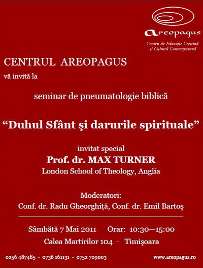 Avem deosebita plăcere de a vă invita la seminarul de pneumatologie biblică „DUHUL SFÂNT ŞI DARURILE SPIRITUALE”, susţinut de reputatul prof. dr. Max Turner, sâmbătă 7 Mai 2011, la centrul Areopagus din Timişoara, strada Martirilor 104.