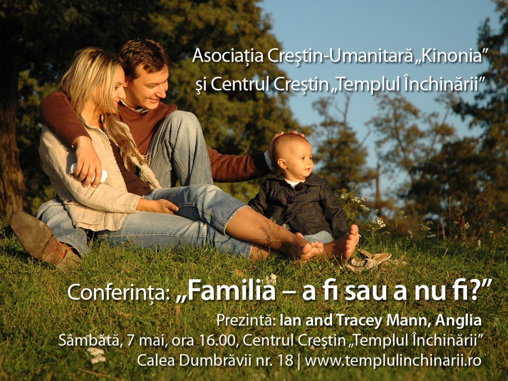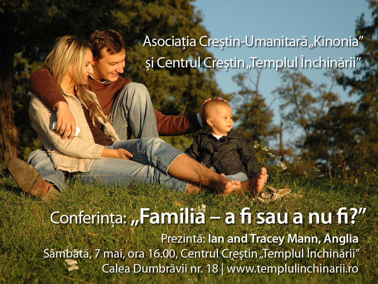 Asociaţia Creştin-Umanitară „Kinonia” şi Centrul Creştin „Templul Închinării”, vă invită sâmbătă, 7 mai, ora 16.00, la conferinţa cu tema: „Familia – a fi sau a nu fi?”.