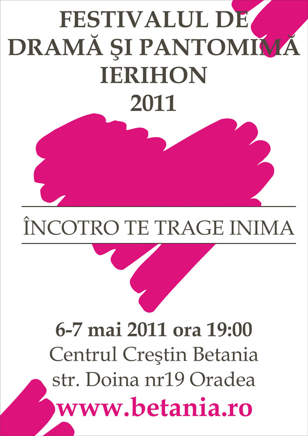 Share Facebook Twitter LinkedIn Pinterest Email În data de 6-7 mai , de la ora 18:00, vă așteptăm la Oradea la biserica Betania, la a VI-a ediție a¨ Festivalului de Dramă și Pantomimă¨. Tema festivalului este “Încotro te trage inima“. Apreciază:Apreciază Încarc...