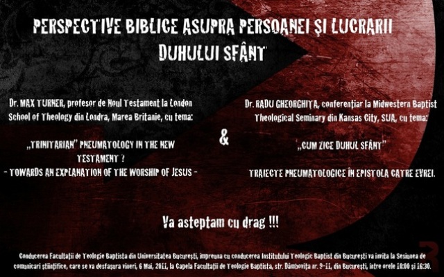 Conducerea Facultăţii de Teologie Baptistă din Universitatea Bucureşti, împreună cu conducerea Institutului Teologic Baptist din Bucureşti vă invită la Sesiunea de comunicări ştiinţifice, care se va desfăşura vineri, 6 Mai, 2011, la Capela Facultăţii de Teologie Baptistă, str. Dâmboviţa nr. 9-11, din Bucureşti, între orele 10:00 şi 16:30. Invitați speciali: dr. Radu Ghiorghiță și dr. Max Turner.
