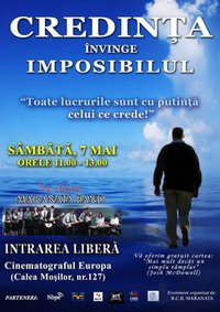 Sâmbătă, 07 mai 2011, Asociaţia Creştină “Dunamis” organizează conferinţa cu tema: “Credinţa învinge imposibilul”. În deschiderea evenimentului va cânta trupa Maranata Band.¨ Totul este posibil pentru cel ce crede¨ este îndemnul organizatorilor. Cum? Veniţi şi vedeţi. Evenimentul se va desfăşura în incinta Cinematografului “Europa” începând cu ora 11:00.