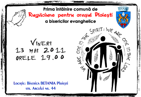 Share Facebook Twitter LinkedIn Pinterest Email Prima întânire comună de dugăciune pentru orașul Ploiești a bisericilor evanghelice va avea loc vineri, 13 mai 2011 de la orele 19:00 la Biserica Betania Ploiești care se află pe Strada Arcului, Nr. 44 Apreciază:Apreciază Încarc...