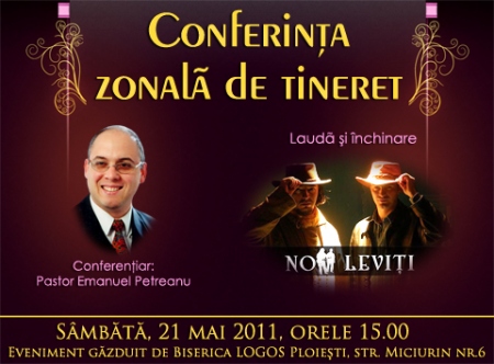 Sâmbătă, 21 mai 2011, Biserica Logos va găzdui o Conferinţă zonală pentru tineret. Pentru timpul de laudă şi închinare va fi prezentă trupa “Noii Leviţi”, iar conferenţiar, pastorul Emanuel Petreanu.