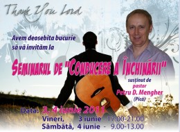 Acest seminar se adresează exclusiv liderilor de închinare, asistenților acestora și celor ce vor să se pregătească pentru a conduce în viitor închinarea. Liderii de închinare au fost expuși unei lucrări în care nu a existat o pregătire de specialitate, ei fiind trimiși într-o bătălie în care pionierau, adesea fiind singuri, tensionați, neînțelegând ce se cere de la ei, lucrând cu o categorie de oameni, muzicieni pe care nu știau cum să îi înțeleagă și cum să comunice constructiv cu ei. Într-o atmosferă caldă, dechisă și sinceră, liderii de închinare vor avea ocazia să se redescopere, să-și poată privi critic, dar și constructiv lucrarea, primind ajutor și învățând principiile de bază ale conducerii închinării. Vorbitor: Postor Petru D. Mengher (Pică) Data: 3-4 iunie, 2011 Program:Vineri, 3 iunie: 17.00-21.00 Sâmbătă, 4 iunie: 9.00-13.00 Locația: Sala mică a bisericii „Agape” din Timișoara (Calea Aradului, nr.15A). Din subiectele abordate: