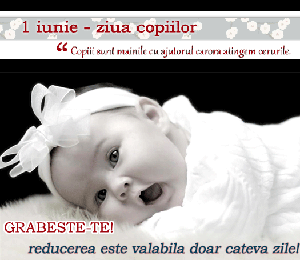 În câteva zile ne vom sărbători, cu mic cu mare, ziua copilului. Ei, cei care ne fac zilele mai frumoase, îndulcind vremurile, cei care colorează lumea în culorile bucuriei și ne determină să mergem mai departe prin forța zâmbetului lor, merită toată atenția noastră! Iar atenția aceasta se măsoară în timpul petrecut cu ei, în grija crescândă a fiecărei zi, dar și în modalitatea în care le alegem cadourile. Și pentru că dorim ca acele cadouri să cântărească mult în formarea lor, să îndrepte pașii lor micuți spre cer, am ales să vă oferim reducere la o seamă de cărți destinate copiilor. La mulți ani tuturor copiilor care vă înconjoară. Linkul promoției este : http://us1.campaign-archive1.com/?u=64d2cf63fb98f334f406892db&id=bf6b91cba6&e=c869ca78da
