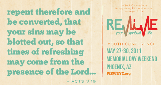 Împreună cu Bisericile “Elim” şi “Happy Valley” din Phoenix, Arizona vă invităm să participaţi la a 2-a Conferinţă de Tineret West & South West Romanian Youth Conference, între 27 şi 30 mai Memorial Day Weekend, 2011, Conferinţă ce va fi organizată pentru al doilea an consecutiv de Biserica Happy Valley. Suntem binecuvântaţi din nou în acest an cu promisiunea participării mai multor biserici şi anticipăm Harul şi prezenţa Domnului în desfăşurarea acestei Conferinţe. Tema acestui an este “REVIVE Your Spiritual Life” şi fiecare seară va avea o tematică ce vorbeşte nevoilor tinerilor noştri. Ataşat aveţi “Screen Posterul” ce-l puteţi afişa în bisericile dumneavoastră. Acesta conţine toate informaţiile necesare. De asemenea puteţi vizita www.wswryc.org pentru mai multe informaţii, inclusiv hotelurile din apropiere.