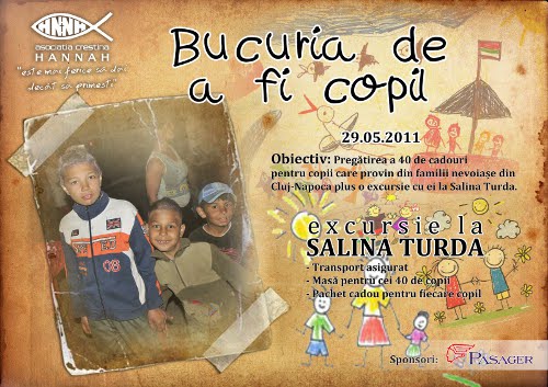 Bucuria de a fi copil – Proiect susţinut de Asociaţia HannahAsociaţia Creştină „HaNNaH” a demarat o campanie locală de strângere de dulciuri, rechizite, jucării şi articole de igienă personală, pentru ajutorarea unui număr de 40 de copii proveniţi din familii fără venituri sau cu venituri foarte mici, din Cluj-Napoca.