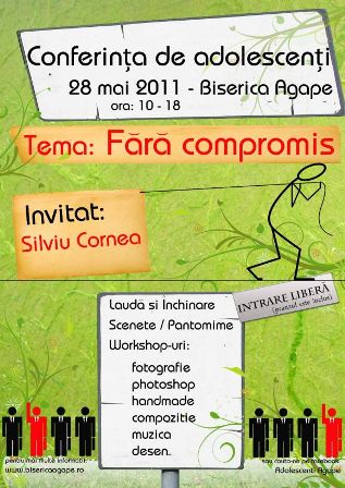 Sâmbătă, 28 mai 2011, toţi adolescenţii sunt invitaţi la Arad. Ediţia 2011 a conferinţei pentru adolescenţi are tema: „Fără compromis”. Evenimentul va fi găzduit de biserica „Agape” şi îl are ca invitat pe pastorul Silviu Cornea. Programul de o zi include jocuri, workshop-uri de photoshop, fotografie, compoziţie, muzică şi desen.