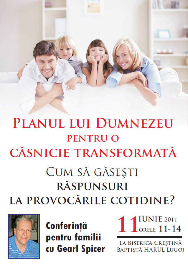 Biserica Crestină Baptistă “Harul” din Lugoj, în colaborare cu “One Heart” Baptist Church Atlanta, organizează, în data de 11 iunie, conferința pentru familii, cu tema: ” Planul lui Dumnezeu pentru o căsnicie transformată – Cum să găsești răspunsuri la provocările cotidiene?”