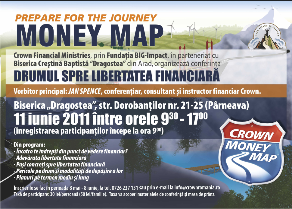 Sâmbătă, 11 iunie 2011 Biserica Baptistă “Dragostea” din Arad găzduieşte conferinţa cu tema “Drumul spre libertatea financiară”. Evenimentul este organizat de Crown Financial Ministries prin Fundaţia “BIG Impact” România. Va conferenţia consultantul şi instructorul financiar Crown, Jan Spence.