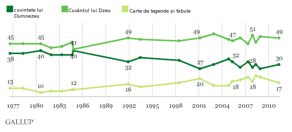 Intervievaţii şi-au exprimat opţiunea faţă din Biblie prin alegerea uneia din cele trei întrebări. 1. Conţine Biblia exact cuvintele lui Dumnezeu şi trebuie interpretată literal, cuvânt cu cuvânt? 2. Este Biblia Cuvântul inspirat al lui Dumnezeu, dar nu totul trebuie interpretat literal? 3. Biblia este o carte antică de fabule, legende, istorii şi prescripţii morale, scrisă de oameni?